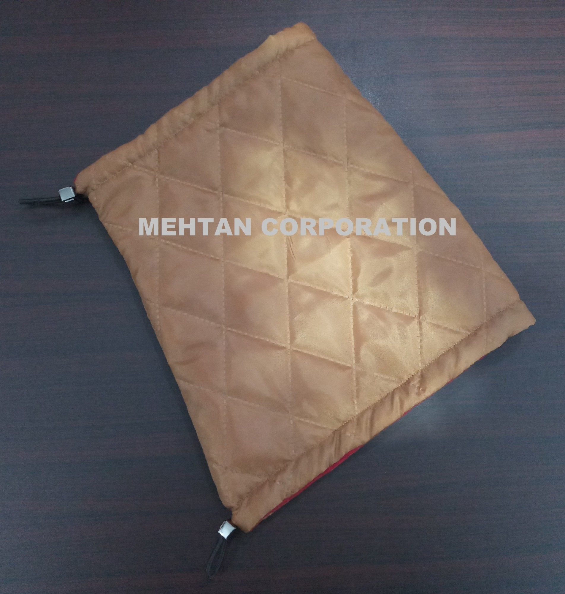 Made of quilted fabric with fleece linning to keep neck warm.